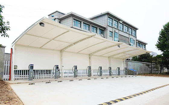 充电桩棚: 充电桩棚采用新型建筑纤维PVDF膜材及异型钢制作而成。