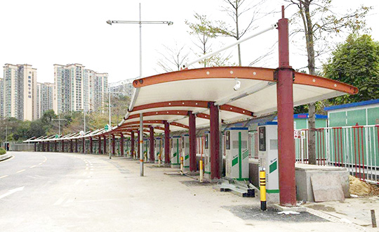 充电桩棚: 充电桩棚采用新型建筑纤维PVDF膜材及异型钢制作而成。