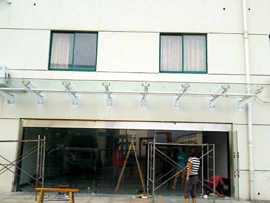 雨篷: 雨篷采用夹胶玻璃或铝塑板材料及异型钢制作而成。