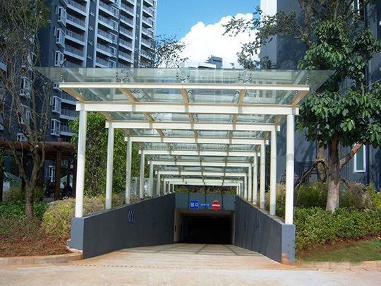 通道雨篷: 雨篷采用夹胶玻璃或铝塑板材料及异型钢制作而成。