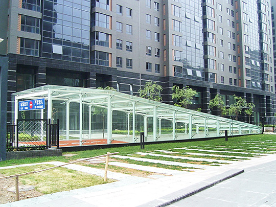 通道雨篷: 雨篷采用夹胶玻璃或铝塑板材料及异型钢制作而成。