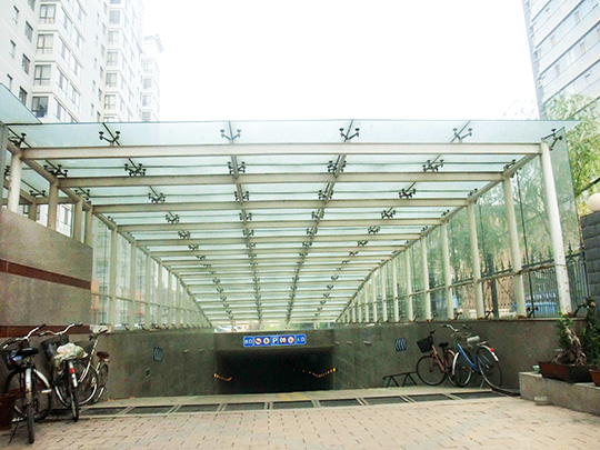 通道雨篷: 雨篷采用夹胶玻璃或铝塑板材料及异型钢制作而成。