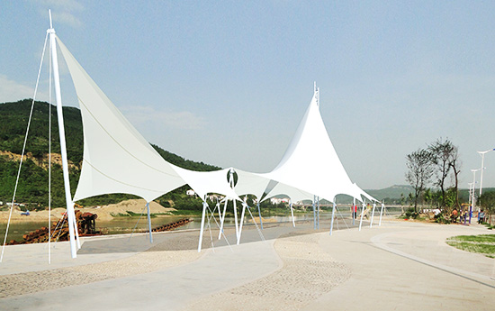膜结构景观: 膜结构景观采用PTFE(可用于永久性建筑)膜材及异型钢制作而成。